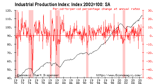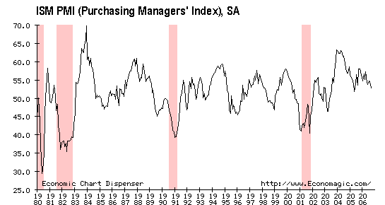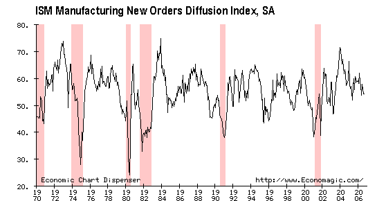 Only time will tell, but the economic indicators (see below), recent GDP trends, and history lean toward the bond market having the more accurate forecast (see previous update Housing & The Markets for some insight). If Q3 2006 GDP does come in at 2.0%, it would represent a 64% decline in economic growth vs. Q1's 5.6% reading. A 2.0% Q3 2006 GDP would mean a 52% decline in growth Y-O-Y vs. Q3 2005. The average GDP reading for the last six quarters is 3.48% or 1.74 times more (read better) than the expected 2.0% in Q3 2006. These figures show an economy that is at best slowing down significantly. These figures also tell us that the bond market may be right after all.