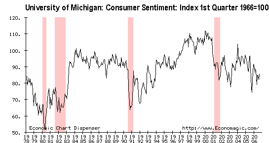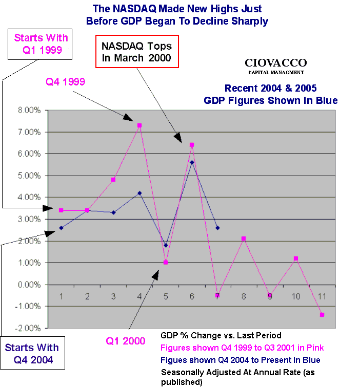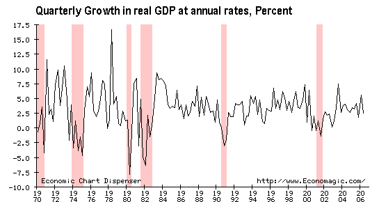 Many of the soft landing supporters, point to the stock market as a reason to not be concerned about future GDP reports. As the chart below shows, the stock market is not always good at forecasting economic slowdowns or recessions. In March of 2000, the NASDAQ powered to new highs just as the economy, as measured by gross domestic product (GDP), was beginning to significantly slow down. In the spring of 2001, once again, stock investors got ahead of themselves pushing the S&P 500 up 18% from April 4th to May 21, 2001. The market thought the Federal Reserve would be able to save the slowing economy with lower interest rates. This is the same talk heard on Wall Street today. Unfortunately, the FED was not able to save the economy (see GDP rate of change in pink) or stocks despite aggressive rate cuts in 2001 (the FED funds rate dropped from 6.0% to 1.5%). After the 18% run up in stocks in 2001, the S&P 500 dropped 40% once it became clear that stock investors got it wrong and the economy continued to weaken. The blue line in the chart shows recent GDP rates of change from Q4 2004 to the last published reading for Q2 2006. While somewhat meaningless due to the low number of data points, it is interesting to note the similar trend in the two series.