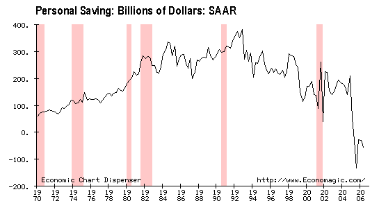 Many of the soft landing supporters, point to the stock market as a reason to not be concerned about future GDP reports. As the chart below shows, the stock market is not always good at forecasting economic slowdowns or recessions. In March of 2000, the NASDAQ powered to new highs just as the economy, as measured by gross domestic product (GDP), was beginning to significantly slow down. In the spring of 2001, once again, stock investors got ahead of themselves pushing the S&P 500 up 18% from April 4th to May 21, 2001. The market thought the Federal Reserve would be able to save the slowing economy with lower interest rates. This is the same talk heard on Wall Street today. Unfortunately, the FED was not able to save the economy (see GDP rate of change in pink) or stocks despite aggressive rate cuts in 2001 (the FED funds rate dropped from 6.0% to 1.5%). After the 18% run up in stocks in 2001, the S&P 500 dropped 40% once it became clear that stock investors got it wrong and the economy continued to weaken. The blue line in the chart shows recent GDP rates of change from Q4 2004 to the last published reading for Q2 2006. While somewhat meaningless due to the low number of data points, it is interesting to note the similar trend in the two series.
